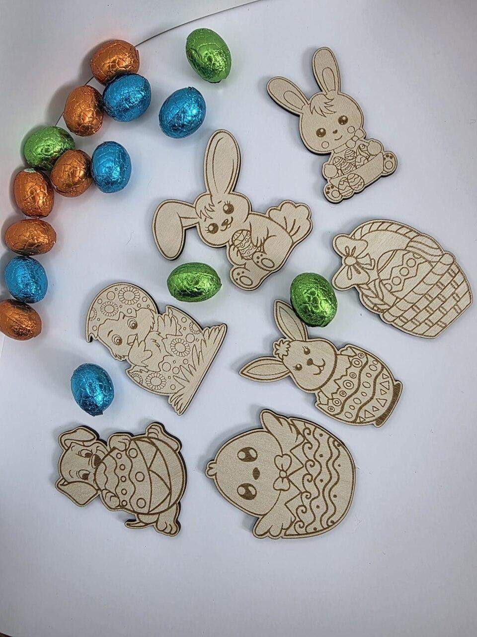 Zestaw uroczych ozdób wielkanocnych wykonanych z naturalnej sklejki. Idealne do dekoracji stołu, stroików, koszyczka wielkanocnego lub kreatywnych prac plastycznych!