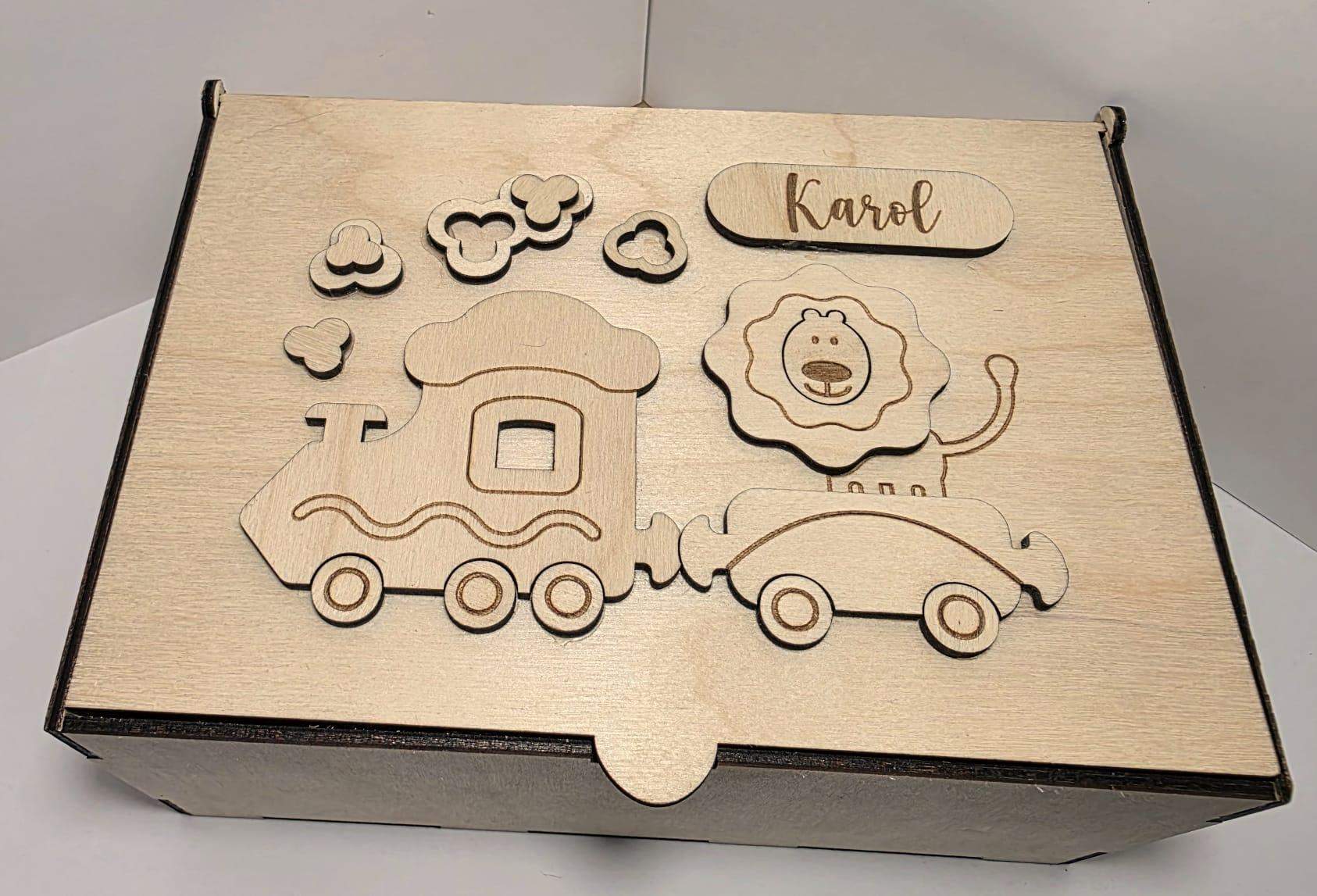 Chcesz zachować najpiękniejsze pierwsze pamiątki Twojego dziecka w jednym miejscu? To pudełko jest stworzone właśnie do tego! Na froncie znajduje się uroczy lew w pociągu, a my grawerujemy imię Twojego maluszka, dzięki czemu każda pamiątka staje się wyjątkowa i niepowtarzalna.