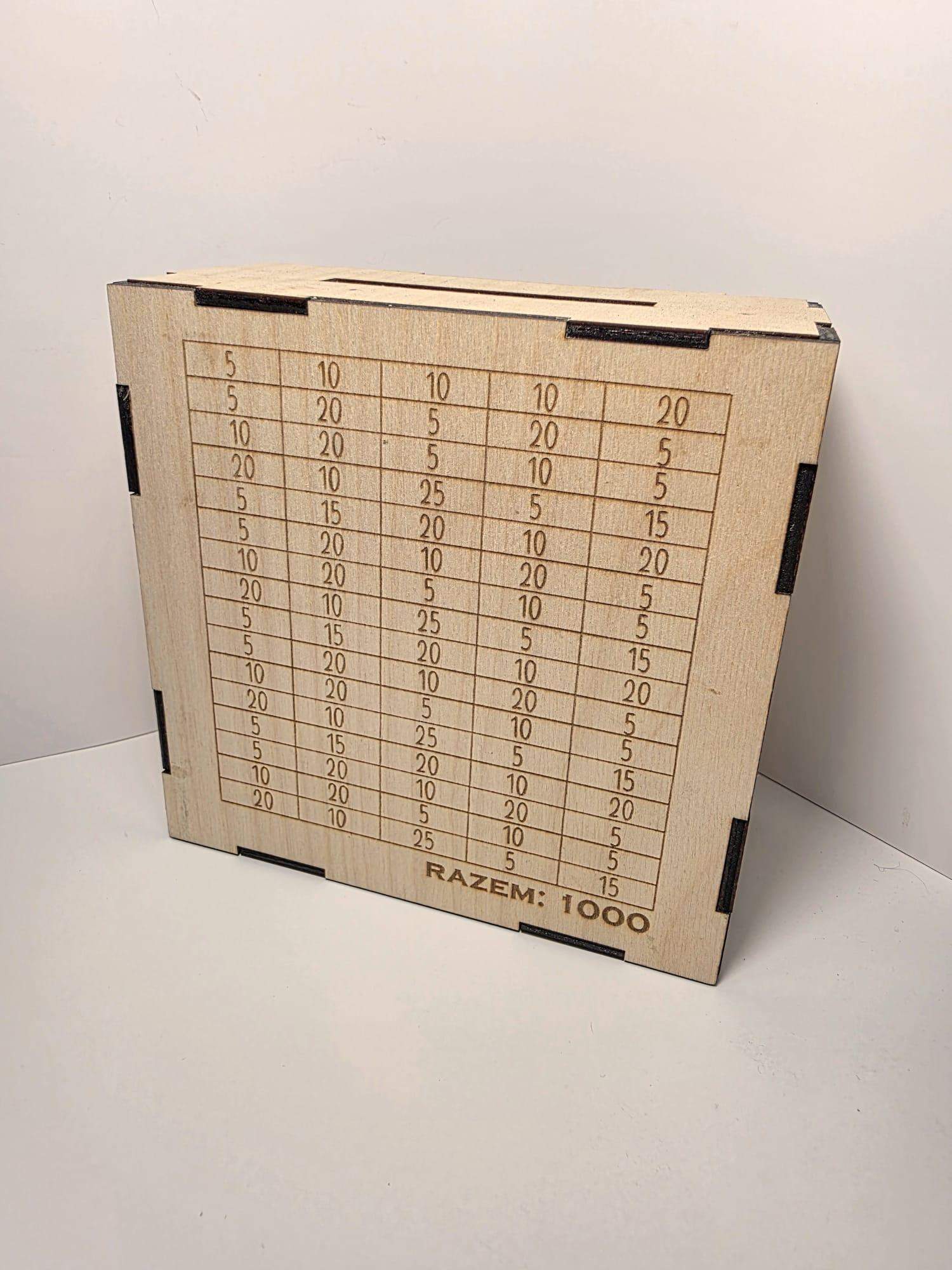 Oszczędzanie może być zabawą! Nasza drewniana skarbonka w formie wykreślanki pozwala Twojemu dziecku (lub Tobie 😉) zakrywać kolejne pola, jednocześnie zbierając drobne oszczędności.