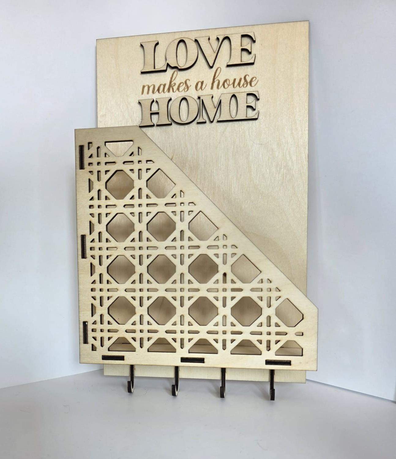 🔑 Funkcjonalność i estetyka – miejsce na klucze i korespondencję w jednym. 💖 Symboliczny napis – podkreśla domowe ciepło i miłość. 🌿 Naturalne wykonanie – ekologiczna sklejka, możliwość personalizacji.